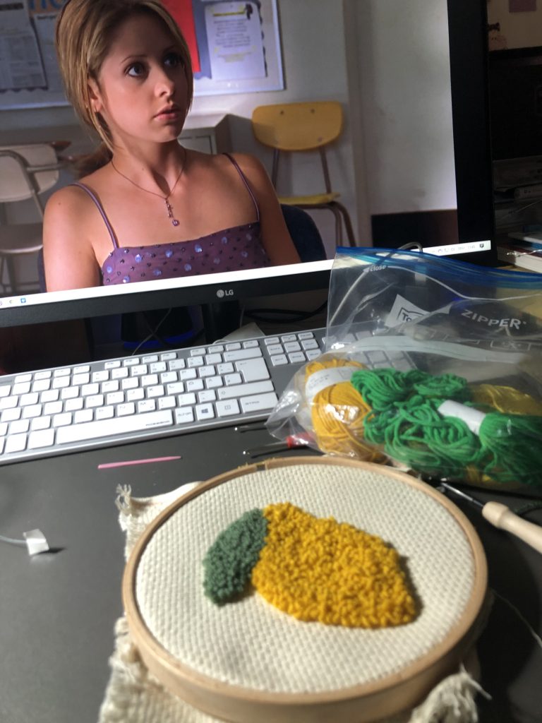 Ich habe auch noch weitere crafty Pläne für den September. Ich möchte den Skill des Häkelns endlich meistern. Es kann doch gar nicht so schwer sein, aber meine Hände verkrampfen sich beim Gedanken eine Masche mit der anderen zu verbinden. Hier siehst du wie meine ehemaligen Versuche ausgesehen haben. Wenn der Plan nicht aufgeht, dann werde ich mich wieder der Punch Needle Art widmen. Da hatte ich damals wenigstens den Dreh schon raus. (Das Bild erinnert mich daran, dass ich wieder Buffy schauen könnte!)
